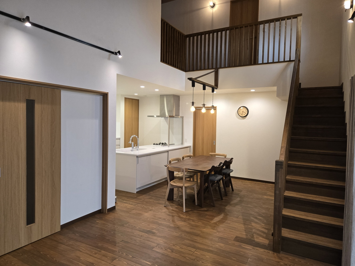 梁見せ天井と吹き抜けが心地よい一体LDKは、家族の気配をやさしくつなぐ中心空間。