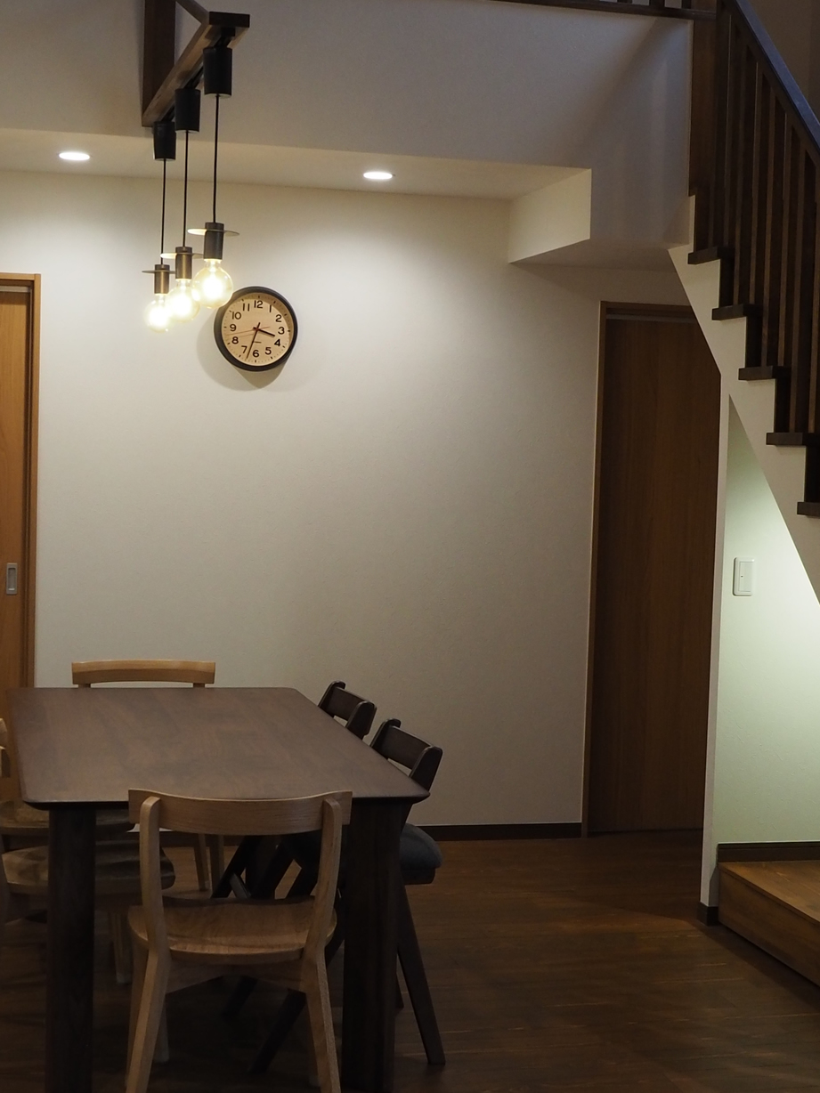 濃淡の木とやわらかな灯りに包まれた吹き抜けLDK。
